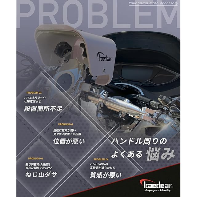 【調整式】 本来の剛性を高める上では六角イモネジでの調整機構は望ましくありません。しかしニーズはドレスアップ要素とマウントパーツのクランプバーとして高まる中で、ねじ式は伸ばすとねじ山が見えてしまいルックスに問題があります。そこでKaedearアジャストブレースではイモネジ式を採用し、伸ばしてもスタイルが変わらない仕様としました。またクランプバー部分は削り出しの角度が傾斜であるほどかっこよく見える一方で、マウントできる面積が減ってしまいます。その双方をバランスよく設計し、ビジュアルとマウント面積を最大限に確保したハンドルブレースとなりました。 【美しい艶とクールな艶無し】 CNCならではのアルミ感を強調する為、太いバーを艶あり、ハンドル固定部とアジャストの軸を艶無しで仕上げました。発色に差を作ることで締まりがあり、より美しさが強調されます。 【商品詳細】 ■サイズ:取り付け径22mm、バー径22mm/12.7mm、調整範囲330mm~225mm、 ■重量200g ■材質:アルミニウム合金 ■内容:ハンドルブレース一式 ■取扱説明書(オンラインのみ):環境負荷の軽減を目指した脱炭素化への取り組みとして、紙媒体での同封を控えさせていただいております。Kaedear公式サイトの各商品ページから閲覧またはダウンロードが可能です。【メーカー】 ■メーカー期間:1年(ご購入日と同日が期限) カエディアではお客様にご満足頂ける様、販売後もサポートさせて頂きます。 商品のご不明な点はもちろん、バイクへのお取り付けに関するご相談は、国家整備資格を保有したスタッフがおりますので、専門知識に対しても的確に対応させて頂きます。 万一、製品不良に起因する不具合と診断される場合は、弊社のメーカー規定に基づき審議させて頂き、メーカーによる無償での修理、交換を行わせて頂きます。業務用に使用される際は、メーカー期間を半分の期間とさせて頂きます(例:メーカー期間が1年の場合、6ヶ月となり、ご購入日の月に6ヶ月を加算した同日が期限)詳細は公式サイト内メーカー規定をご覧下さい。 お取り付け後、ご使用後でも、対応させて頂きます。日本メーカーとして、おもてなしの心で対応致します。先ずはお気軽にご相談下さい。" 【ご注意】ハンドル径22.0-22.2mm標準ハンドル専用です。28.6-22.0mmテーパーハンドルのテーパー部分や標準ハンドルでもカーブしている部分へのお取り付けは内径の削り加工やワッシャーでクランプを調整する必要がある場合があります。