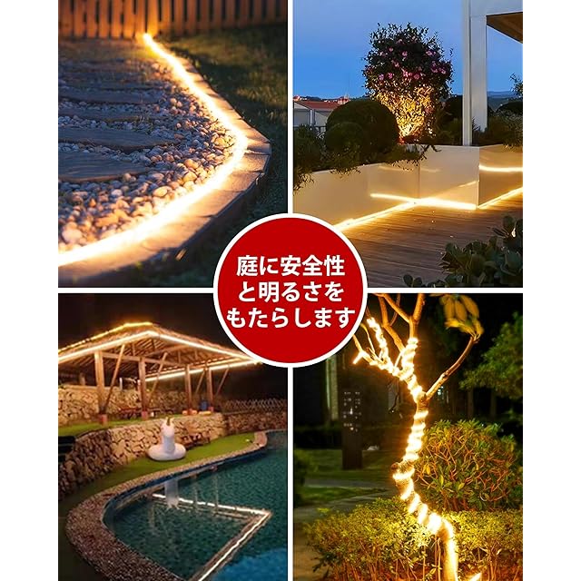 アップグレードされたソーラー テープライト:このLEDテープライト5mは高輝度の300枚LEDを配置されたため、輝度はほかのledテープライトより明るくなります;屋外テープライトは幅10mm、厚さ5mmで、柔軟性が向上して折れにくいですので、長くご利用いただけます。注意してください: これらのライトは屋外の装飾に最適な柔らかな周囲光を提供しますが、広いエリアの高輝度照明に代わるものではありません。