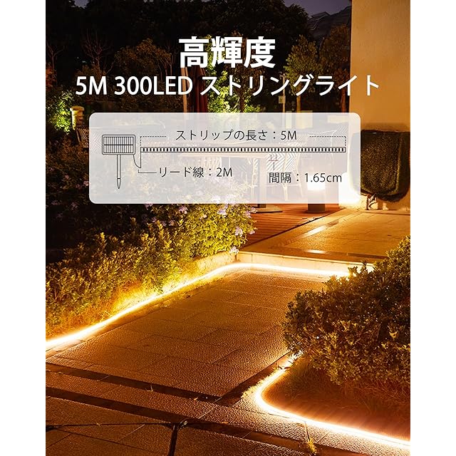 商品名:LIFENGSOLER 5m LEDテープライト ソーラー 屋外 8種照明モード 遠隔操作可能 LEDテープライト 防水 300LED 温白色 3000K テープライト ソーラー 屋外 ソーラー充電とUSB充電 庭園 屋外照明 デッキ ポーチ ベランダ ガーデン パーテ装飾用