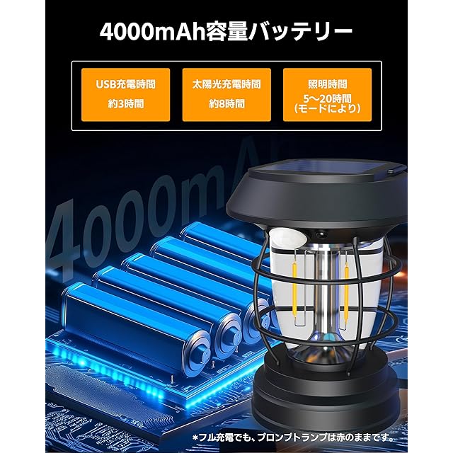 商品名:LED ランタン ソーラー 充電式 キャンプ 【人感センサー &4000mAh】 4つ点灯モード 作業灯 コードレス 超高輝度 災害 ライト スームルーム ランタン 防水 アウトドア 車中泊 登山 夜釣り 防災 停電 緊急 非常用 電球色