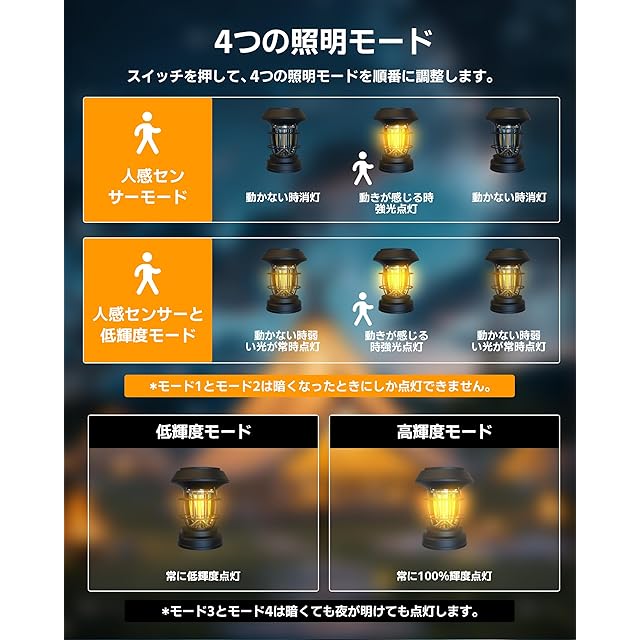 【4モード切り替えで多彩なシーンに対応】このLED ランタンはスマートセンサー技術を採用:1. 人感センサーモード(暗所で人を感知→自動点灯/20秒後に消灯)。2. 省エネモード(暗所で微光待機→人感知でフル点灯→30秒後自動復帰)。3. 常時点灯モード(50%明るさ)。4. 常時点灯モード(100%明るさ)。※防災ライトとして夜間のトイレ移動時や緊急時にも便利 。