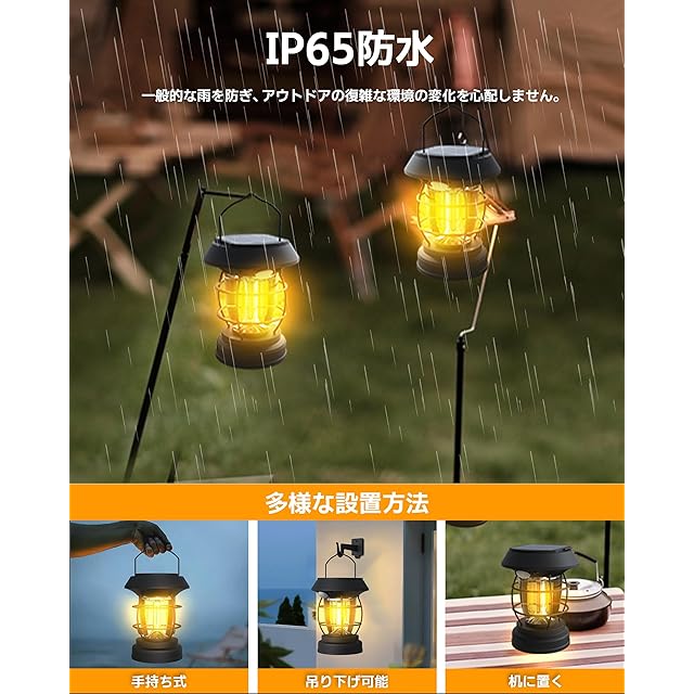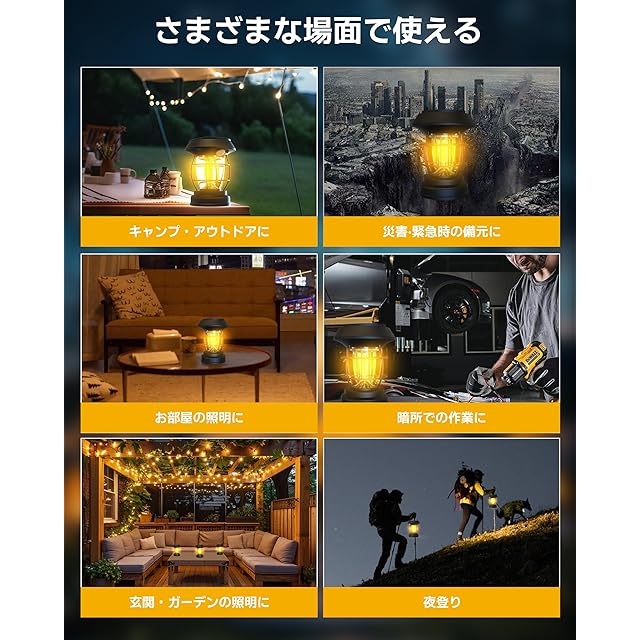 【マルチユースで一家に一台の必需品】付属のフックとネジで:テント天井から吊るすメイン照明に ・キャンプテーブルの上でムードライトに ・防災ライトとして玄関や車内に常備 ・ガーデンライトや夜間作業灯として。停電時や災害時はもちろん、日常使いにも最適なソーラーランタンです。