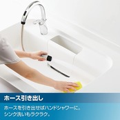 【ホ-スを伸ばして使えるシャワー】ホースを引き出せばハンドシャワーに早変わり。シンクの掃除も簡単に行えます。