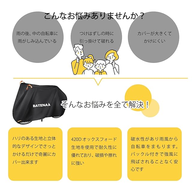 BATENA(バテナ)自転車カバー 超厚手 420D 3サイズ 取っ手付き 防水 防風 防塵 防雪 UV加工 撥水加工 破れにくい 日焼け防止 3層構造 サイクルカバー 風飛び防止バックル付き 収納袋付き