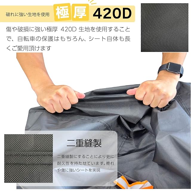 【破れに強い420D生地使用】傷や破損に強い生地を使用する事で、自転車に保護は勿論、シート自体も長くご使用いただけます! また、縫製は2重縫製で更に耐久性を持たせ擦れや傷に強カバーを実現しました!!