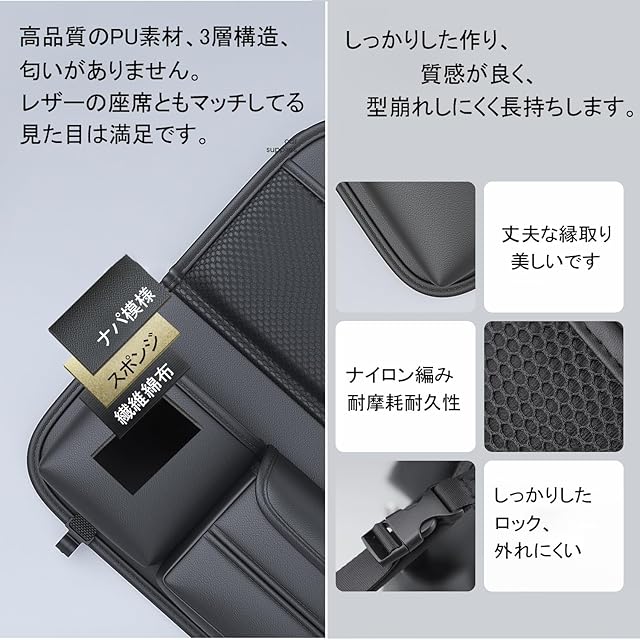 【厳選素材・高級感】 この車収納ポケットは高級感漂うPU革素材で作られており、滑らかな触り心地が特徴です。どんな車にも調和するデザインで、車内のインテリアを一層引き立てます。製造過程でしっかりと芯材が入れられているため、型崩れしにくく長持ちします。