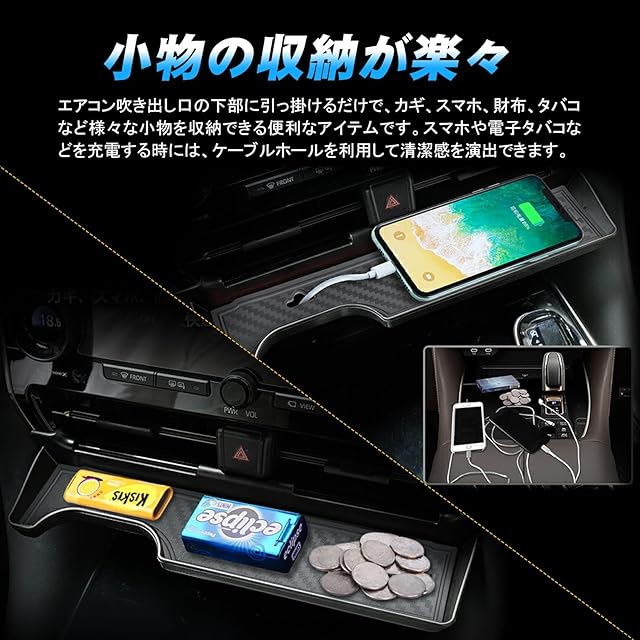 【小物の収納が楽々】エアコン吹き出し口の下部に引っ掛けるだけで、カギ、スマホ、財布、タバコなど様々な小物を収納できる便利なアイテムです。スマホや電子タバコなどを充電する時には、ケーブルホールを利用して清潔感を演出できます。