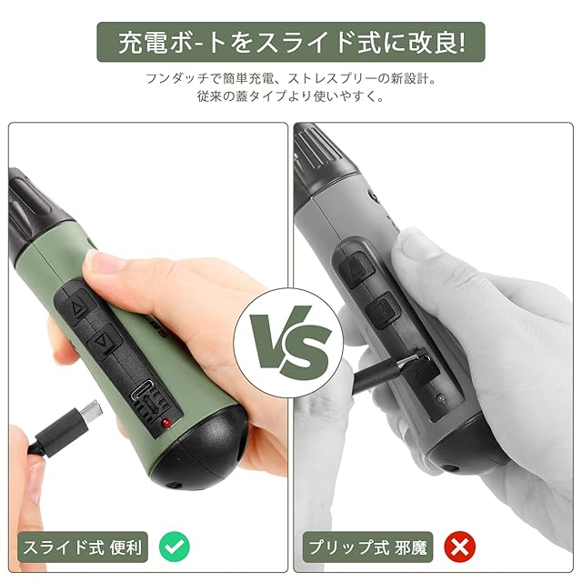 【USB Type-C充電式&コードレス】USB-Cポート採用で充電が簡単。パソコンやモバイルバッテリーからも充電可能。スライド式充電カバー採用で、従来の開閉式カバーより簡単に充電可能。