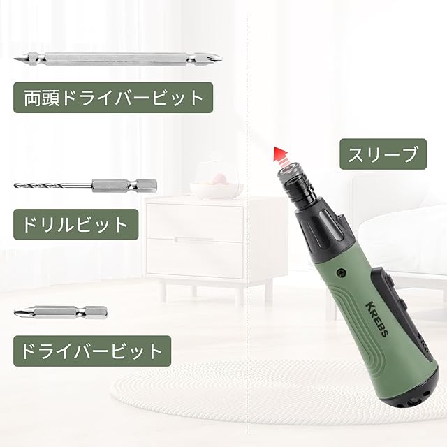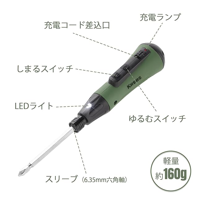 商品名:KREBS(クレブス) 電動ドライバー ペン型 電動ドリル 3.6V USB Type-C充電式 13本ビットセット付き 超軽量小型 初心者女性向け 電動ドリルドライバー LEDライト付き 家具組み立て DIY作業 卓上修理