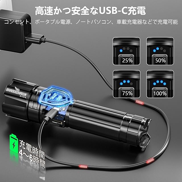 【懐中電灯充電式&パワフルな26650電池&出力設計】S1476電池式懐中電灯は、通常の5000mahバッテリーよりも長寿命の新しい大容量5000mAh26650バッテリーを採用しています。 1回の充電で最大8時間(ミディアムモード)の強力で減らされていない明るさを提供します。この電池式懐中電灯はUSB-Cケーブルを使用するので、より便利に充電できます。懐中電灯は過充電保護を採用しており、充電が完了すると自動に停止します。 USB出力設計により、この充電式懐中電灯は、携帯電話、タブレット、その他の電子デジタル製品を充電できます。地震、津波、停電などの際の非常用電源としてもご利用いただけますので、非常に便利な機能と言わざるを得ません!