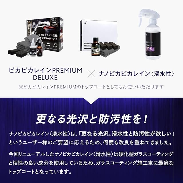 ナノピカピカレイン滑水性はピカピカレインプレミアムに限りなく近い成分をベースに手軽に使用できるよう独自の技術で開発されたアイテムです。