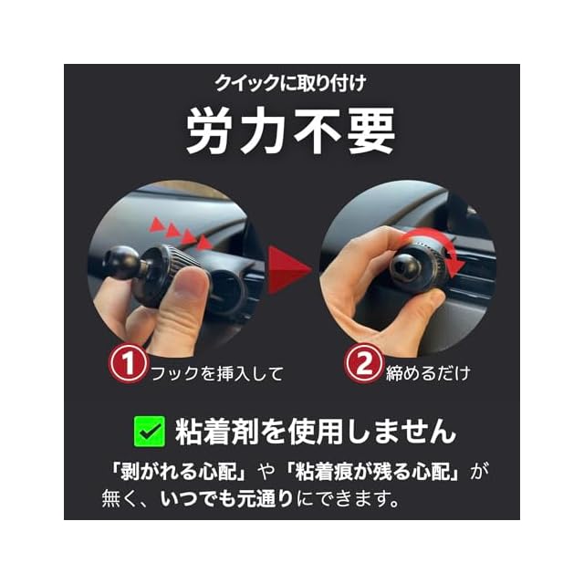 【簡単取り付け】ダイヤルを回転させエアコンルーバーに固定するだけなので慣れれば10秒以内に脱着可能です。装着状態でも左右の風向調整が可能なので快適性を犠牲にしません。