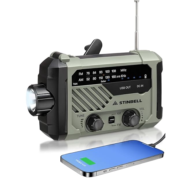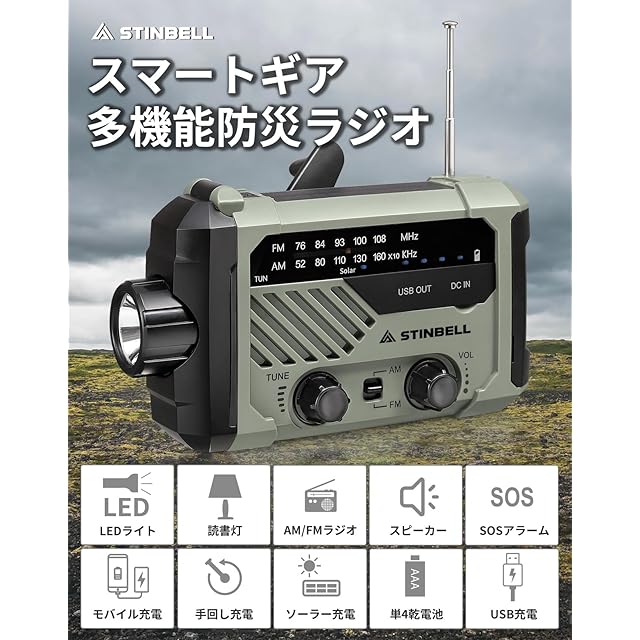 【大災害に備える】防災ラジオ 多機能 携帯 手回し充電ラジオ 2000mAhバッテリ SOSアラート付き 懐中電灯 AM/FM 台風 地震 津波 緊急対策 小型 非常用バッテリー 防災用 アウトドア キャンプ 緊急用 USB充電式 単4電池式 非常用 ソーラー充電 スマホ充電 LEDライト 災害グッズ 小型 日本語取扱説明書 24STMR290 STINBELL (アーミーグリーン)