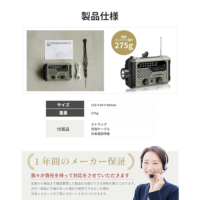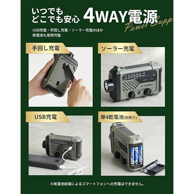商品名:【大災害に備える】防災ラジオ 多機能 携帯 手回し充電ラジオ 2000mAhバッテリ SOSアラート付き 懐中電灯 AM/FM 台風 地震 津波 緊急対策 小型 非常用バッテリー 防災用 アウトドア キャンプ 緊急用 USB充電式 単4電池式 非常用 ソーラー充電 スマホ充電 LEDライト 災害グッズ 小型 日本語取扱説明書 24STMR290 STINBELL (アーミーグリーン)