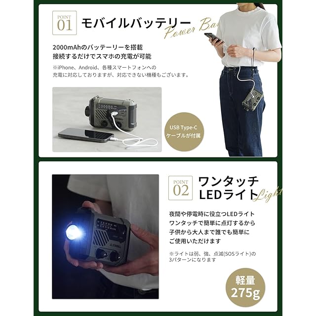✅ 【“困った”を解決する、非常用スマートギア。3役こなす多機能防災ラジオ**】停電でスマホが使えない、真っ暗な夜道が怖い——そんな非常時の「不安」を解決する多機能防災ラジオ。ラジオ、ライト、スマホ充電の3役をこれ1台で。手回しやソーラーにも対応し、どんな時も電源を確保。コンパクトでも、あなたと家族を守る“スマートな安心”を届けます。 ✅【AM/FM/ワイドFM対応・275gの手のひら防災基地】「コンパクトだけど頼りになる」。275gの防災ラジオは、もしもの時の情報源・ライト・充電器が一体化した“手のひら基地”。小さくてもフル機能。AM/FM/ワイドFM対応(AM:520~1710KHz、FM:76~108MHz、ワイドFM:76~95MHz)で、災害時も正確な情報を逃しません。日常でも使えるから、防災がもっと身近に。 ✅【 4WAY電源、2000mAhバッテリー。備えを極めた“機能で守る”防災ラジオ】「家族を守る」そのためにできることを、この一台に。手回し充電、USB充電、ソーラー充電、単4乾電池の4WAY電源を採用。日常用と防災用の両方に対応し、「おうとしたら充電が無かった」という心配を防ぎます。ソーラー充電は太陽光の下に置くだけで充電可能。緊急時には手回し充電も可能です。 ✅【多機能防災ラジオ&懐中電灯機能&SOSアラーム】LEDライトを搭載し、夜間や停電時に便利です。読書灯としても使えるため、普段使いにも適しています。非常時には大音量の「SOSアアーム」機能で周囲に危険を知らせ、安全を確保。懐中電灯付きで停電時にも安心です。緊急用として一つ常備しておくことをおすすめします。ボタンを短く押すとライトモードが切り替わり、長押しでSOSサイレン+フラッシュライトが作動します。 ✅【災害時のマストアイテム。“持ち歩ける安心”スマートギア】重さわずか275gで、手のひらサイズのコンパクト設計。どこにでも収納でき、軽量で持ち運びも容易、アウトドアでのキャンプや旅行にも最適です。ラジオからのニュースや音楽をいつでもどこでも楽しめます。 ✅【梱包内容&安心アフターサポート】梱包内容:ラジオ本体、USBケーブル、日本語取扱説明書。1年間のメーカー付きで、商品の故障や不具合にも迅速に対応いたします。お気軽にお問い合わせください。