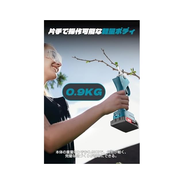 【軽量化と安全性を両立】本電動枝切り鋏では、手首や腕への負担を軽減するため、本体重量わずか854gの超軽量設計を実現します。長時間の剪定作業でも、電動剪定ばさみならリラックスした快適な操作感を維持できます。小型でコンパクトなボディ設計により、高所や狭い場所でもフレキシブルに作業できます。誤ってスイッチを入れてしまう可能性を減らすため、この枝切りバサミはトリガーを2回引くことで作動するセーフティロックを採用しており、より 安心・安全に作業を行うことができます。