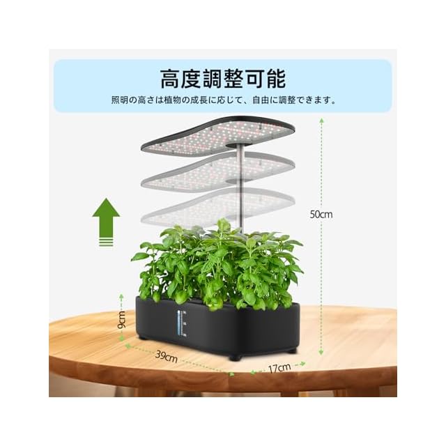 高さ調整可能で室内栽培に最適:植物の成長に合わせて高さを調整可能なLEDライトを搭載。均一な光を確保し、室内での水耕栽培をサポート。取り外し可能なライトポールでメンテナンスも簡単。大葉やハーブの栽培にも最適です