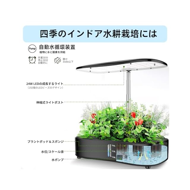 自動水循環システムで簡単管理: 超静音の自動水循環システムを搭載した水耕栽培キット。4リットルの大容量タンクで植物に常に十分な水分を供給。30分ごとに作動するポンプが酸素を供給し、根の成長をサポート。観察窓から水位と根の状態を簡単に確認可能。