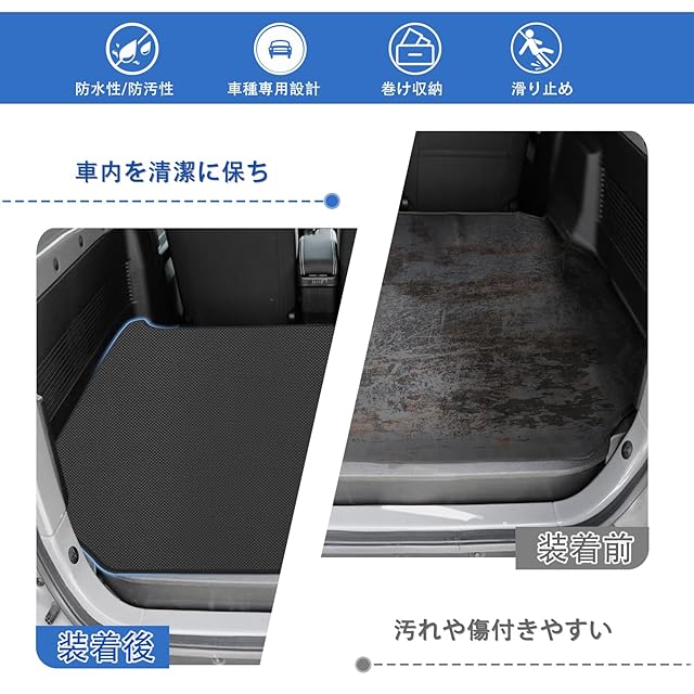 【新改良 高品質PVC滑り止め素材】:高品質なPVC素材を採用されたマットは、防水性、柔軟性、耐久性に優れた、曲げ癖や折跡が残りにくいです。ラゲッジマット表面は、PVC防水素材で凹凸があり、荷物の移動を防止し、水や汚れに強くて、汚れても水拭ができ手入れも簡単です。ラゲッジマット裏面はザラザラしたマジックテープ式で、マット全体がしっかりとグリップしてズレにくく、安全に快適に使えます。