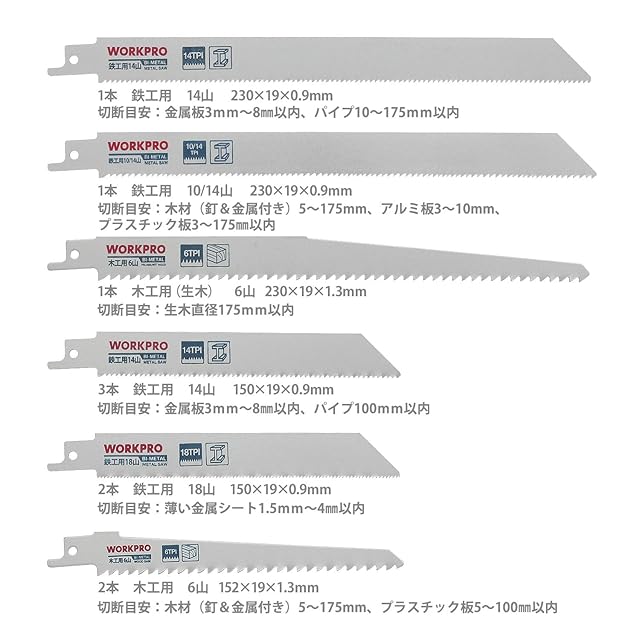 商品名:WORKPRO レシプロソー替刃 電気のこぎり替え刃 鉄工・木工用 金属 ステンレス 非鉄金属 プラスチックパイプ 収納ケース付き 10点组