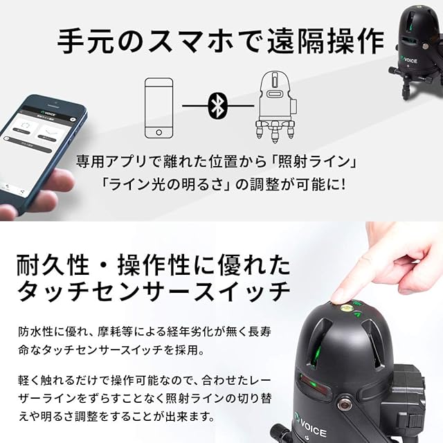 【シリーズ累 96,000台突破!】VOICE レーザー墨出し器から、デザインと機能をアップグレードしたモデルが登場。マットブラックを基調としたスタイリッシュなデザイン。専用アプリを使うことで、手元のスマートフォンから「照射ライン」や「ラインの明るさ」の調整が可能に。