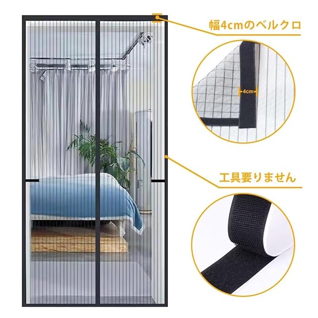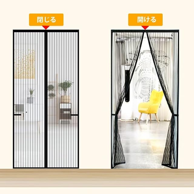【自動開閉】ドアカーテンは4cm幅のマジックテープを採用し、ドア枠にもっとしっかりくっつくことができ、耐荷重がもっと強いです。 強力な磁石を内蔵し、人やペットが通った後、素早く静かに閉めることができます。