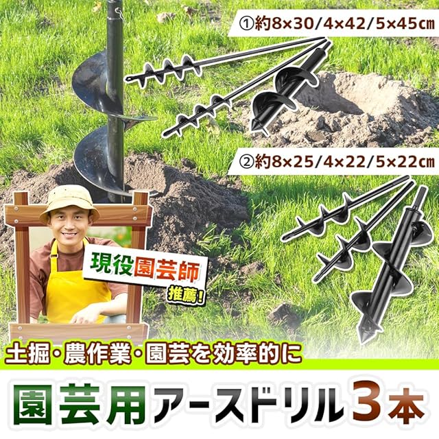 お持ちの電動工具にセットしスイッチを押すだけ!初心者でも簡単に土が掘れる園芸用アースドリルです。 支柱設置・苗の植え込み・杭打ちなどの穴開け作業にお役立ていただけます。 開けたい穴の大きさによって使い分けられるよう、異なる3サイズセットでご用意いたしました。 手作業では体の負担が大きい上に時間が掛かってしまう…そんなお悩みに答えます。