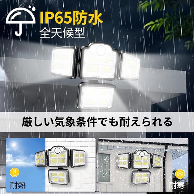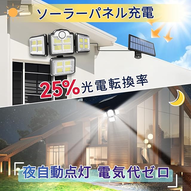 ✅1.発電量1.8W:発電量の多い方は、日照が少ない曇りの日や、朝夕の弱い光でも効果的に発電でき、充電時間も短縮できます(最大充満時間4-6時間)。✅2.大容量電池2400mAh:満電最大照明時間は8-10時間、点灯回数に替えば約400回点灯できます。✅3.昼光色6000k超高輝度3000ルーメンのLEDチップを搭載します(照明範囲は最大20畳)。✅4.高感度の人感+光感PIR動体検知センサーを搭載します(感知範囲は最大12.5畳)。