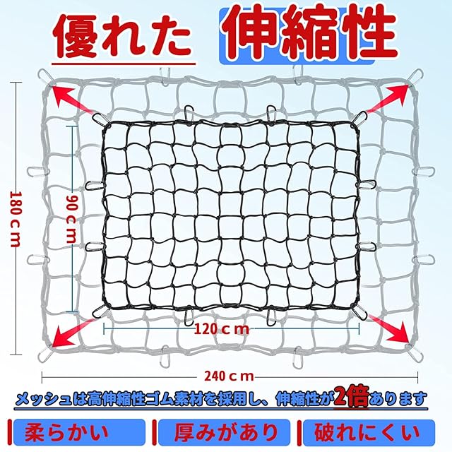 【優れた伸縮性】カーゴネットは丈夫で高品質なナイロンメッシュ製で、柔軟性があり、柔らかく、厚みがあり、破れにくい。メッシュデザインと適度な伸縮性により、凸凹のある未舗装路でも荷物をしっかりと固定し、荷崩れを防ぐので、車の運転に集中できる。