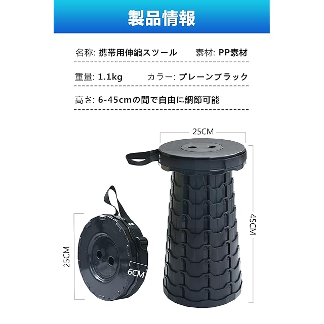 <b>折りたたみ椅子 携帯に便利 1秒で開閉、簡単操作 高さ調節可能</b><br> 1:折りたたみ椅子は携帯に便利で、持ち運びが簡単です。 <br> 2:折りたたみ椅子は1秒で開閉でき、誰でも簡単に操作できます。 <br> 3:折りたたみ椅子は高さ調節が可能で、使用シーンに応じて自由に調整できます。 <br> 4:折りたたみ椅子は最大耐荷重180kgの頑丈設計で、安定感抜群です。 <br> 5:折りたたみ椅子は多用途で、アウトドアから室内まで様々な場面に対応します。<br> ●この折りたたみ椅子 コンパクトタイプは、わずか1.1kgの超軽量設計で、どこにでも簡単に持ち運べます。折りたたむと高さ6cm、直径25cmの円形になり、付属の収納袋にすっぽり収まり、ストラップ付きで手持ちも肩掛けもラクラク。まるでバッグのような見た目で、他人に椅子 折りたたみだとは気づかれないほどスタイリッシュです。<br> ●この折りたたみ椅子はワンタッチで素早く開閉でき、1秒で設置・収納が可能です。少しひねるだけで座面が展開し、使用後もスムーズに折りたためます。最大高さ45cmまで調節でき、どなたでもお好みの高さで快適に座ることができます。折り畳み椅子初心者やお子様、ご年配の方にも使いやすい設計です。<br> ●本製品は、独自の伸縮構造を採用し、6cmから45cmまでの自由な高さ調節が可能な折りたたみ椅子です。展開前はコンパクトな円盤状で、一見してアウトドアチェアとは思えないスマートな外観。収納袋を使えば省スペースで保管でき、アウトドアや屋内使用に最適です。<br> ●軽量ながらも最大180kgの耐荷重を誇る頑丈な設計の椅子 折りたたみです。滑り止め加工付き座面と多層無縫製ロック構造により、抜群の安定感を実現。高強度のPP素材を採用し、耐衝撃性・耐摩耗性に優れ、長期間安心してお使いいただけます。<br> ●この折りたたみ椅子は、玄関やリビングなど屋内使用から、キャンプ・登山・釣り・運動会といったアウトドアイベントまで幅広く対応します。いつでもどこでも座って休めるアウトドアチェアとして、日常生活に快適さをプラスします。<br>