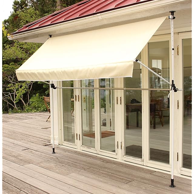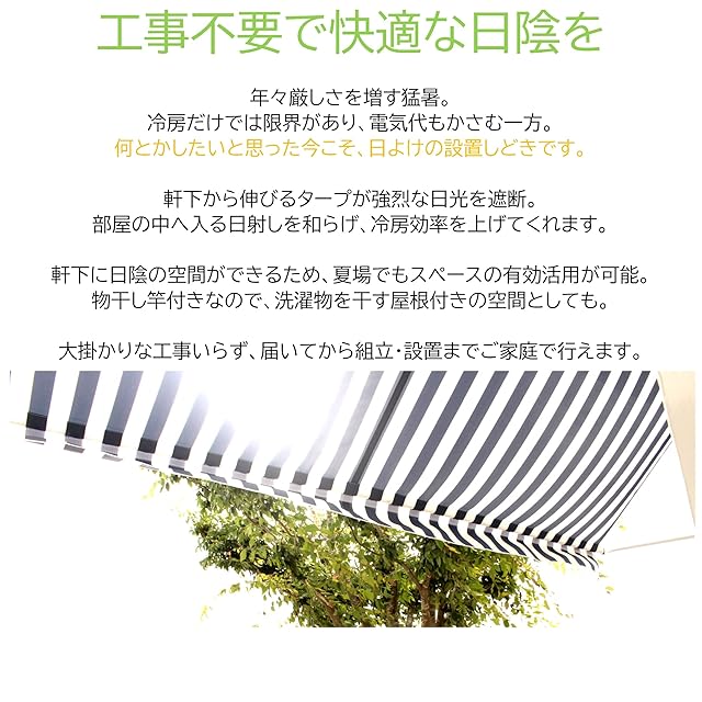 リビングアウト(Living Out) 前幕と物干し竿付きオーニング 幅2m アーム伸縮タイプ 本体:(約)幅203×奥行22~145×高さ200~300cm アーム伸縮タイプ 日よけ 工事不要 冷房効率アップ 物干し竿掛け タープ角度調整可能 シェード アジャスター付支柱