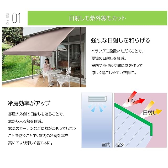 商品名:リビングアウト(Living Out) 前幕と物干し竿付きオーニング 幅2m アーム伸縮タイプ 本体:(約)幅203×奥行22~145×高さ200~300cm アーム伸縮タイプ 日よけ 工事不要 冷房効率アップ 物干し竿掛け タープ角度調整可能 シェード アジャスター付支柱