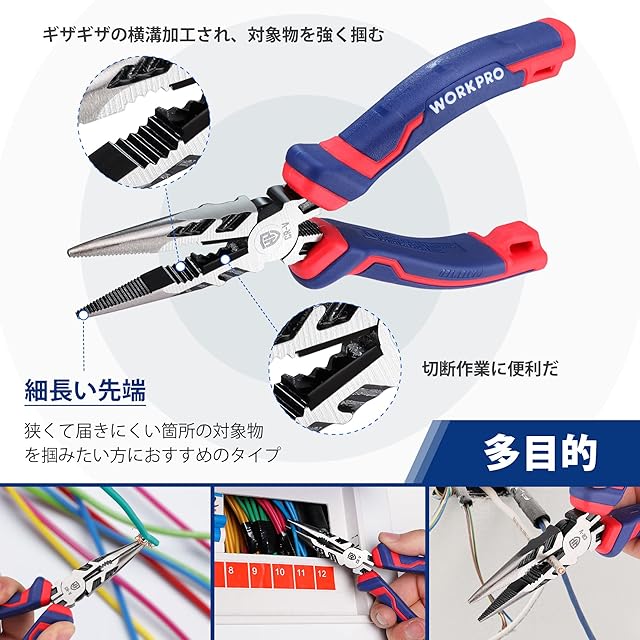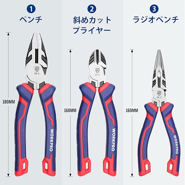 商品名:WORKPRO ペンチセット プライヤーセット 3本セット 強力ペンチ ラジオペンチ 斜めカットプライヤー 強力ニッパー 家庭工事 自働車修理 鋼線切断