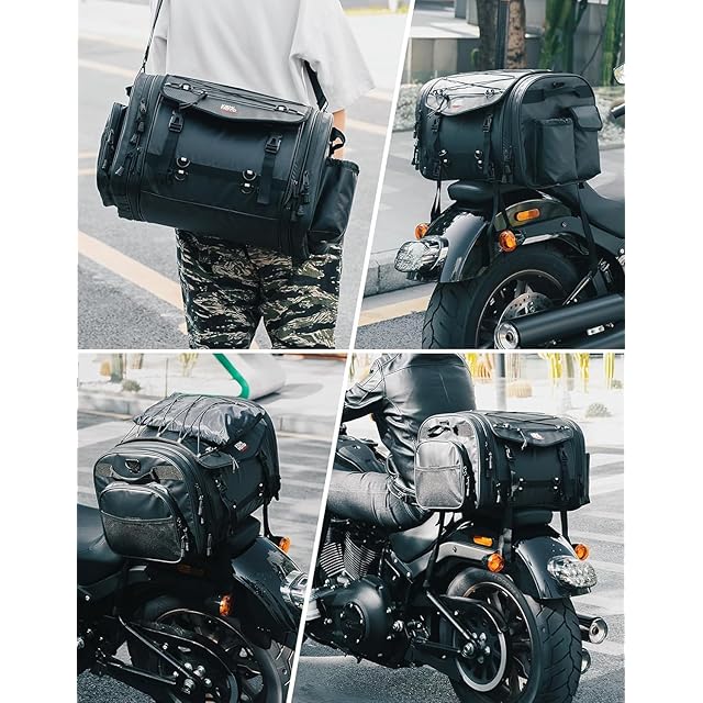 KEMIMOTO シートバッグ PVC防水素材 拡張機能あり 45-65L ツーリングバッグ レインカバー付き 全方位防水性 バイク リアバッグ 変形しにくい 荷物固定ベルト付き バッグ上部積載可能
