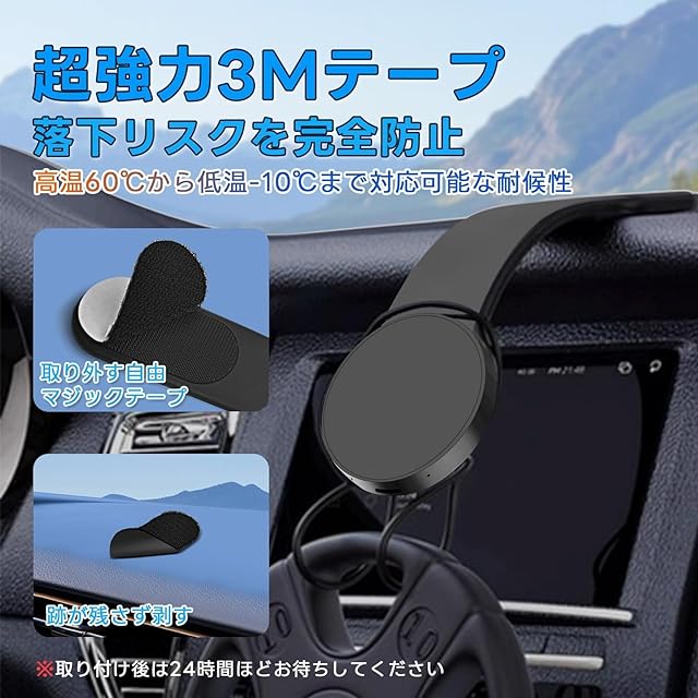 【粘着力抜群・3Mテープ】スマホホルダーはマジックテープと3Mテープで革新的取り付け方法でタッチパネル・ダッシュボード・窓・助手席など、様々な場所に取付可能で無限大な設置場所が実現します。運転の習慣により適合な位置を選んできます。3Mテープは高温60℃から低温-10℃まで対応可能な耐候性があり、跡が残せずに取り外せます。