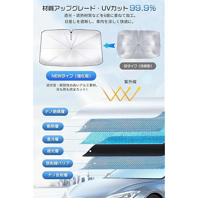 【6層ポリマー断熱&UVカット99.9%】このフロント 車用サンシェード の傘面は6層ナノ高分子断熱材料を採用し、外側はチタンシルバーコーティングで、UVカット率は99%以上、紫外線、赤外線、太陽光から効果的に保護します。強い日差しを反射して車内温度の上昇を抑えますので、外気温が上昇しても駐車中の車内を涼しく暑から守ります。 車を駐車するたびに涼しさを保ちます。また、日焼けで車の内装劣化と損傷を防ぎ、エアコンへの負荷が減られ、省燃費になります。光の眩しさを抑え、車内の温度を下げることで、昼寝中に快適な環境を提供し、車中泊にも利用できる。</p>