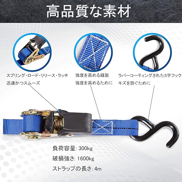 【荷締めベルト】高品質ラチェットストラップセット,工業用素材:ポリエステル、高強度鋼製造ラチェット。 ストラップは強度と耐久性を高めます、しっかりと荷物の締め付けが行えます