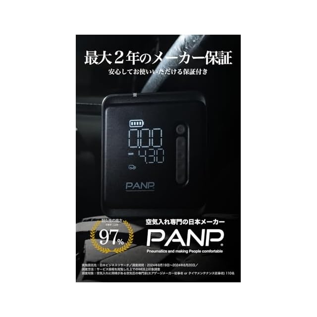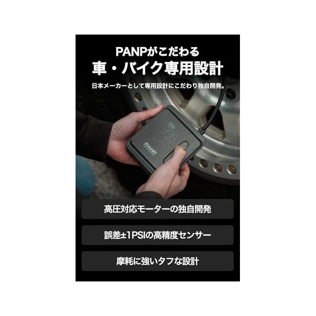 空気入れをもっと楽に、もっと手軽に。PANP(パンプ)が「空気入れの手間をゼロにする」をコンセプトに開発したのが、スマート電動空気入れ「RIDE PRO」です。 空気入れは、従来「時間も労力もかかる面倒な作業」でしたが、PANPならボタン1つで完了します。 【車やバイク、自転車、ボールなど】 あらゆる用途に対応した高性能コンプレッサーを搭載し、大型の車やバイクのタイヤでも約30秒という驚異的な速さで充填可能。 高圧力(最大150PSI)を実現し、正確な空気圧管理が可能です。 複数のバルブ(英式、米式、仏式)に完全対応し、自動車・バイク・自転車からボールまで幅広く使えます。 【こんな方に最適です】 - 車・バイクのメンテナンスを素早く簡単にしたい - 出勤前や外出先でのタイヤ管理に手間をかけたくない - 空気入れに苦手意識があり、簡単に操作できる商品を探している 【主な特徴】 - 「タイヤの種類を問わず使える」全バルブ対応(英式/米式/仏式) - タイヤの空気が適正圧に達すると「自動停止」 - 最大空気圧【150PSI】(大型車両でも迅速に対応) - 空気圧表示単位を4種類から選択可能(PSI, BAR, KPA, Kg/cm²) - 設定した空気圧を用途ごとに自動保存する「メモリー機能」搭載 - 付属品なしでも丁寧なサポート対応(日本メーカー1年) - 動画でわかる「日本語説明書」付き(初めてでも迷わず使える) 【安心の日本メーカー品質】 PANPは、日本企業ならではの品質基準で、厳しい安全性・耐久性テストをクリア。 製品には安心の【1年間メーカー】が付き、万が一の際もサポートいたします。 「RIDE PRO」なら、いつでも手軽に安心の空気圧管理が可能になります。 日常のメンテナンスをもっと楽に、そして安心・快適な毎日をお届けします。