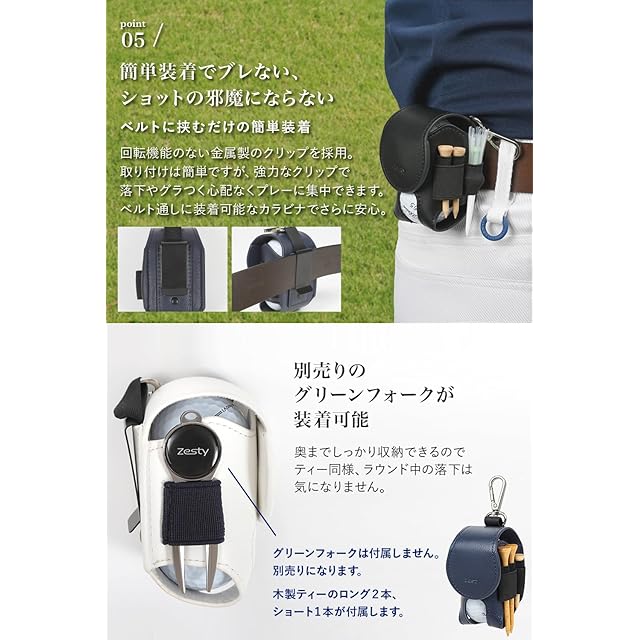 ・【プレーに集中出来るスマートなゴルフボールケース】ゴルフボール2個、グリーンフォーク1個とティーが3~4本とコンパクトサイズに必要なものをひとまとめに出来るゴルフボールケース。 スマートに持ち運びでき、プレーに集中していただけます。※本商品にはグリーンフォークは付属しません。 ・【ボールの出し入れがとてもスムーズ】ボールが取り出しやすい波型構造の取り出し口や、ボールを取り出したらパタっと閉まる、マグネット式のフタなどボールの取り出しもスピーディーかつスムーズに行えます。 ・【様々な太さ、大きさのティーに対応】二重構造のティーポケットは、大きさの違う5つのポケットを内蔵。大きさ、太さの違う様々なティーの収納が可能です。幅の大きなブラシ型ティーも入るので、これ1つで必要なティー全てを持ち歩けます。 ・【高級感あふれる上質なPUレザー仕様】柔らかで滑らかな本革の風合いが高級感を演出。撥水性の高い素材を使用。水、汚れに強く、雨の日でもアクティブに使用可能。重量わずか50g程度のコンパクトなゴルフボールケースです。 ・【商品スペック/サイズ/カラー展開】長さ 約90mm : 幅 約53mm : 厚み 約54mm / 重さ : 約52g 軽量かつコンパクト 素材:PUレザー(高品質合皮)全3色展開。 付属品:ティー3本、グリーンフォークは付属しません。 ・【メーカー180日】Zestyのボールケースはご購入から180日間のメーカーが適用されます。初期不良だけでなく、ご使用の際に発生した問題についても状況に応じて対応させていただきます。万が一、不具合や問題が発生した場合は、ご連絡ください。