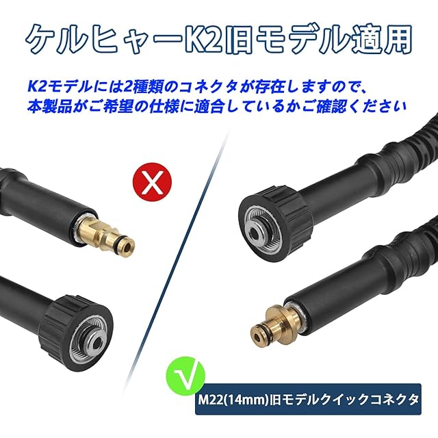 【☆要確認・対応機種】本製品は、旧型のケルヒャーに対応した高圧ホースです。高圧洗浄機側はネジ式接続、トリガーガン側は旧タイプのクリップ式コネクタとなっています。ケルヒャーK2旧モデルやJTKシリーズに対応していますが、【新型モデルには対応しておりません。】※ご購入前に必ず商品画像にて接続口の形状をご確認ください。互換性についてご不明な点がある場合は、「カスタマーQ&A」または「カスタマーサービス」までお気軽にお問い合わせください。