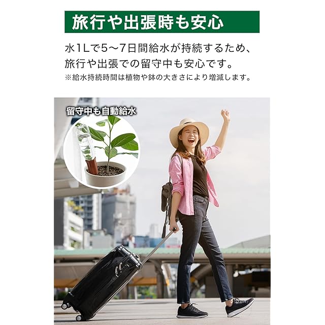 ✅【旅行や出張時も安心】水1Lで5〜7日間給水が持続するため、旅行や出張時も安心です。※植物や鉢の大きさにより給水持続時間は増減します。