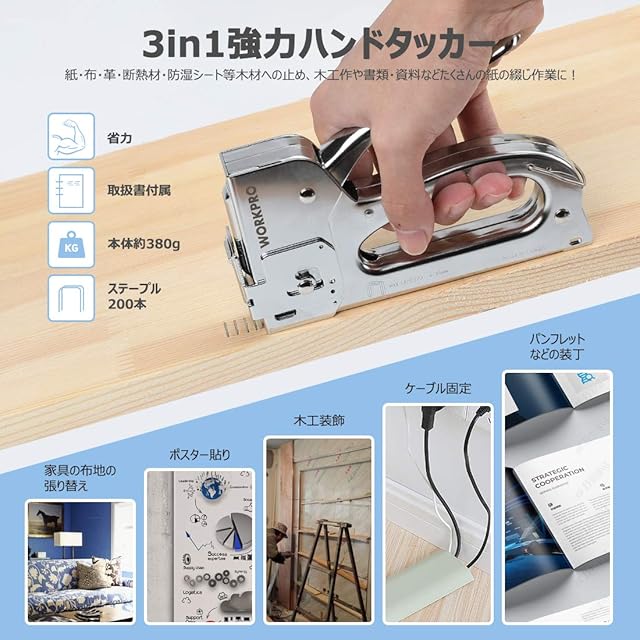 商品名:WORKPRO ガンタッカー ハンドタッカー ステープルガン ホッチキス 【台湾製】 ケーブルタッカー ハンドルロック機能 3in1 替針 200本付き 木工用 DIY 壁紙補修 革シート補修 木材裏止め 大工 家具