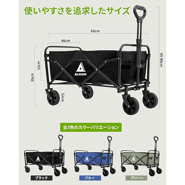 商品名:ALKAID キャリーワゴン キャリーカート アウトドアキャンプカート 折りたたみ式 ワイドタイヤ搭載 耐荷重100kg 大容量120L 自立式収納 コンパクト キャンプ BBQ 釣り 買い物 (ブラック)