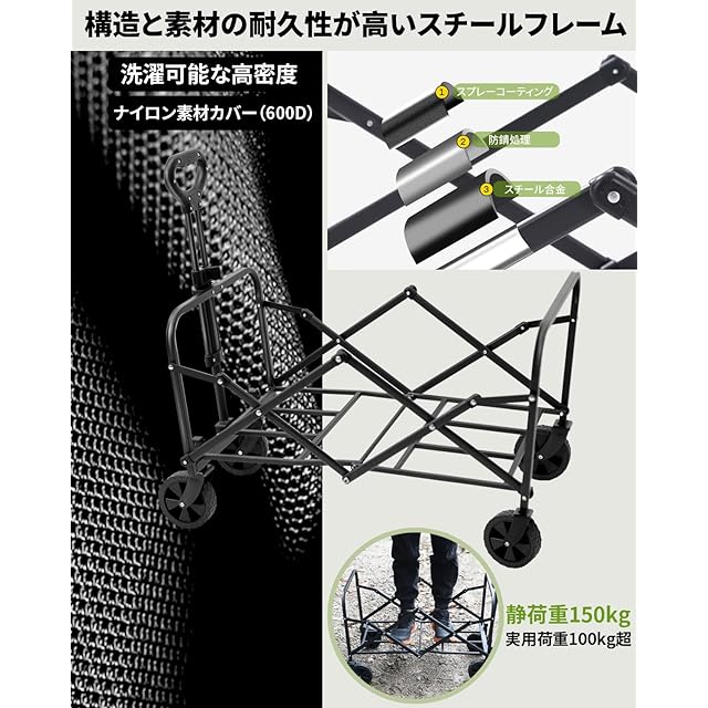 100kg耐荷重 & 頑丈な構造: 防錆処理スチールフレームと高密度600Dオックスフォード生地の強固な組み合わせで、耐荷重100kgを実現。重い荷物や過酷なアウトドア環境での使用にも安心の耐久性。防水加工で天候にも強く、長く愛用できます。