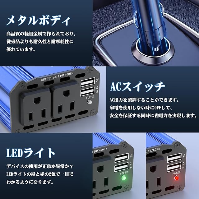 カーインバーターは電や、キャンプ、車中泊など電源(AC100V)が無い環境で使用する場合 に不可欠なものだと思われています。 本製品は修正正弦波で感性負荷の機器に対応できないので(瞬時電力が高すぎる)、ご了承ください。