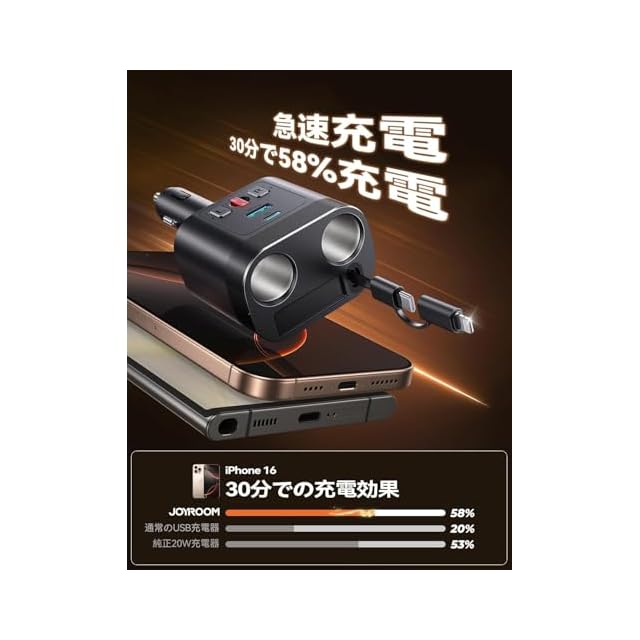 商品名:シガーソケット 増設 JOYROOM シガーソケット 2連【業界初!増設シガーソケット&2in1巻き取り式充電ケーブル】5-in-1多機能車載充電器 増設分配器 カーチャージャー USB 急速充電 ヒューズ搭載 多重保護 2ソケット 独立スイッチ 12-24V車対応