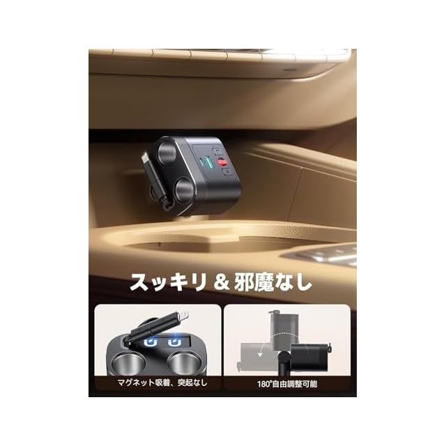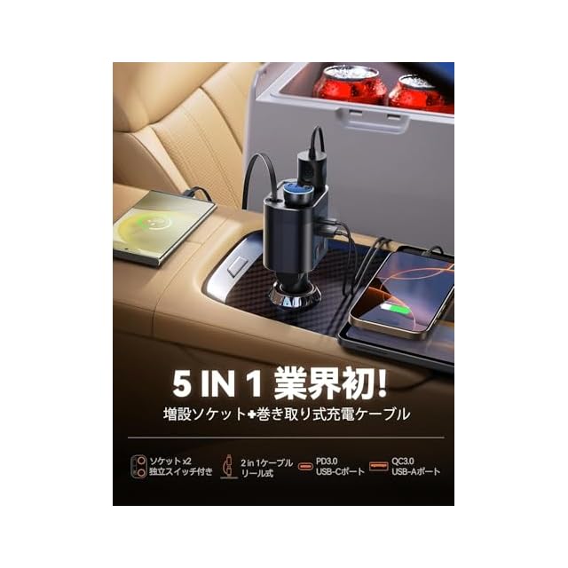 【5-in-1多機能車載充電器】 シガーソケット 増設で2連のシガーライターソケットを搭載します。さらに1本の巻き取り式Type-C to Lightning充電ケーブル、1つのUSB-Cポート、1つのUSBポートを備え、最大5つのデバイスを同時に使用可能です。これ1台あれば、車中のスマホもすべてのデバイスも同時充電OK!さらに、巻き取り式ケーブルで車内を美しく保つだけでなく、使用後もスッキリ収納できます。