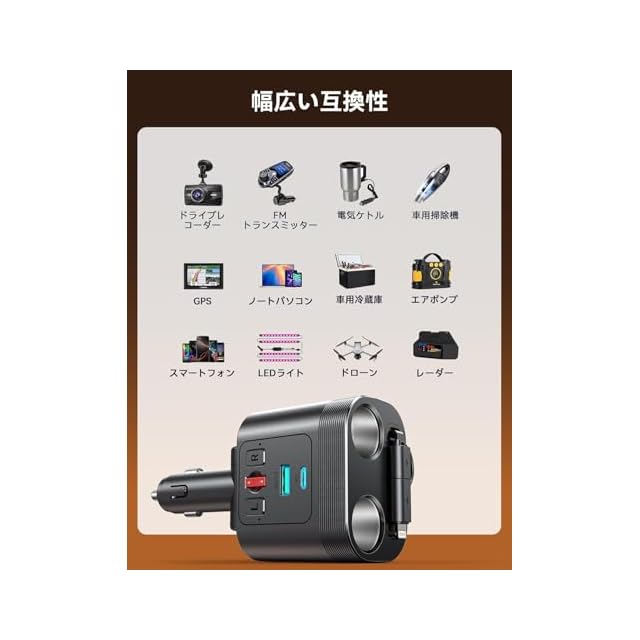 【幅広い互換性で多様なニーズに対応】 このシガーソケット増設分配器は、12Vから24Vまでの電圧に対応し、乗用車、SUV、トラック、キャンピングカーなど、さまざまな車種で使用可能です。スマートフォン、タブレット、ドライブレコーダー、車載冷蔵庫、掃除機、GPS、カメラ、ドローンなど、多様なデバイスをサポートします。