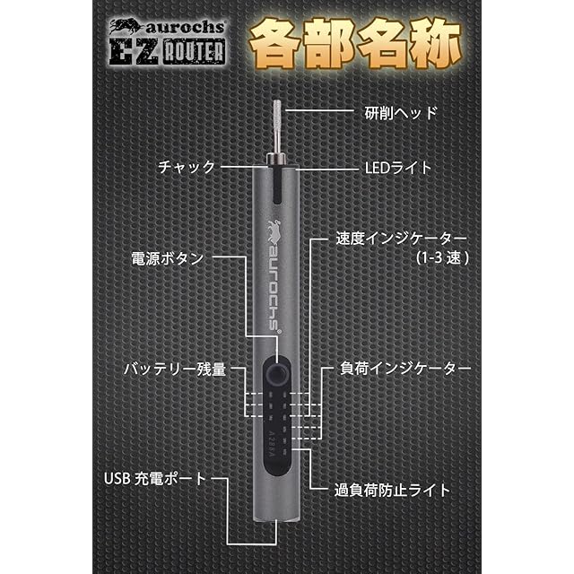 商品名:aurochs 充電式 リューター ミニルーター プラモデル 工具 3段変速 照明付き TYPE-C 小型 コードレス 電動 やすり研磨 彫刻 穴あけ 切断 切削 ホビー 初心者用 (ディープシルバー)