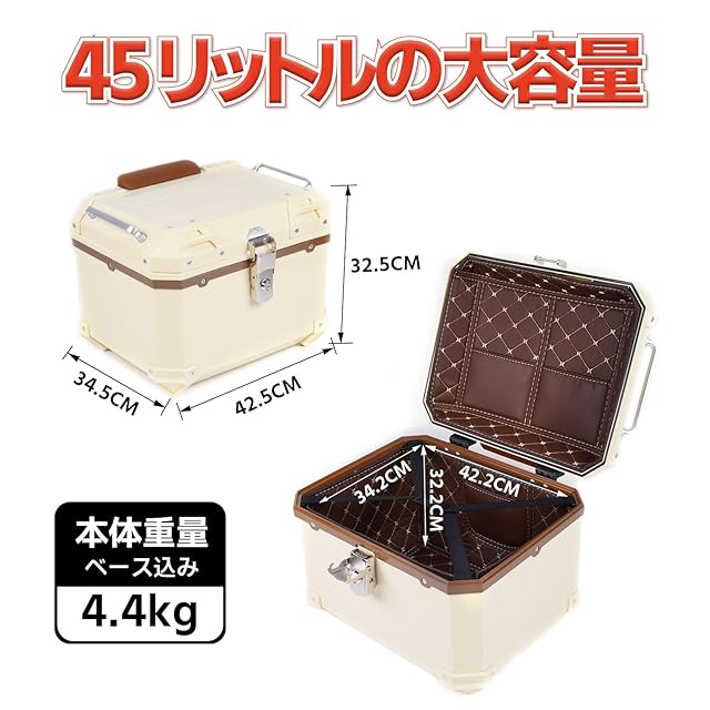 商品名:HI-LINEバイクリアボックス カブリアボックス トップケース 45L バイクケース バイクボックス ハンターカブ/クロスカブ/スーパーカブリアボックス IP68防水 防塵 キーロック可能 防犯対策 耐衝撃 四角 取付ベース付 バックレスト付き カラーフル 簡単着脱 汎用 ABS製